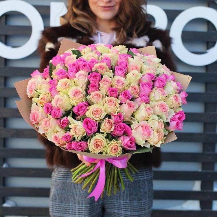 Объемная композиция из роз в бело-розовых тонах выглядит особенно масштабно и нежно. Безупречные продолговатые бутоны превосходно дополняют друг друга и надежно соединены элегантной белоснежной лентой. Белоснежные цветы идеальны для красивого подарка юной девушке, так как они восхваляют её невинность, доброту и открытость. Нежные розовые розы отражают симпатию, нежность и восхищение, но также могут обозначать благодарность и признательность за определенную помощь. Такой букет подойдет не только для романтического свидания, но и для маленькой принцессы в день рождения.