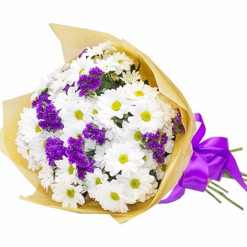 Фиолетовые соцветия станицы обретают вид ярких, порхающих бабочек на ромашковом поле. Такой контраст оттенков является главной фишкой данной композиции и непременно вызовет восхищение не только у получателя, но и у всех окружающих.